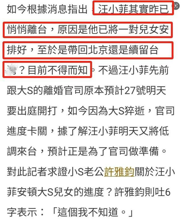 总结来说,台媒曝光的汪小菲安顿俩孩子的进度,虽然不清楚是在宝岛安顿好了,还是在北京安顿好了,但客观来说只要能把孩子安顿好就是极好的。与此同时于情于理来看,俩孩子起码也会等到大S下葬之后才回内地,因此说俩孩子短期内可能仍不会回内地。